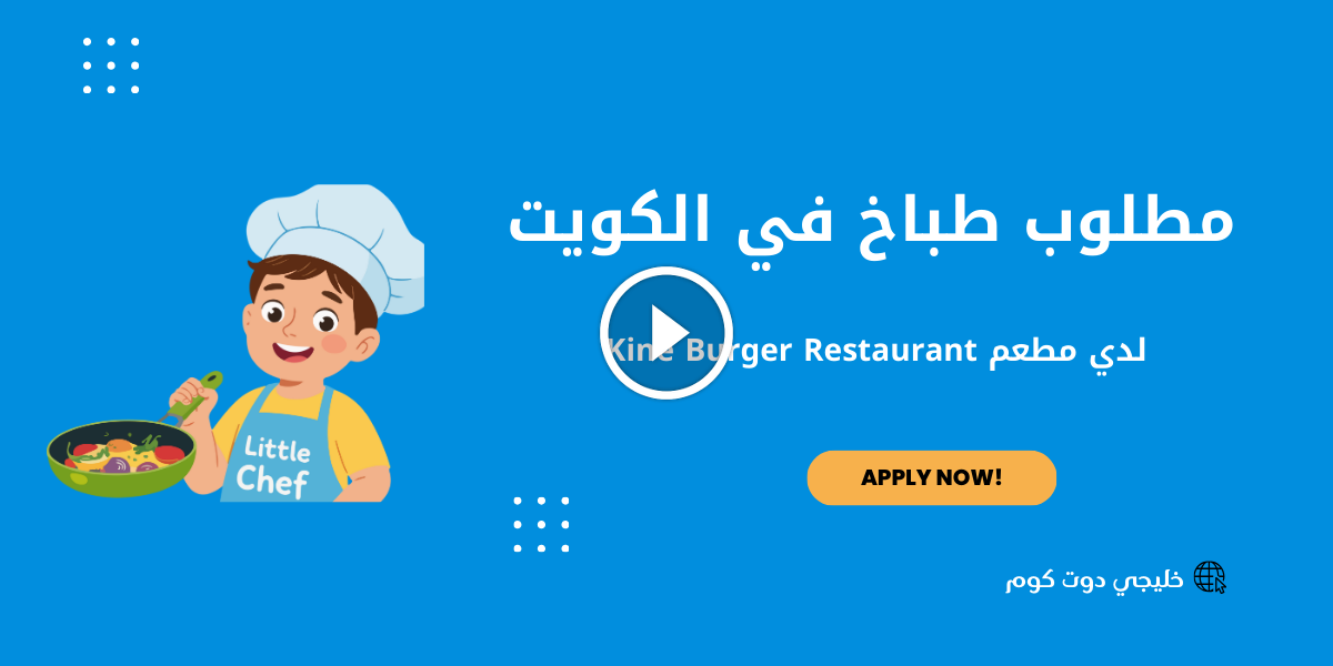 مطلوب طباخ في الكويت لدي مطعم Kine Burger Restaurant، على أن يكون المتقدم مقيمًا داخل الكويت ويمتلك الخبرة الكافية في إعداد الطعام والالتزام بمعايير السلامة الغذائية.