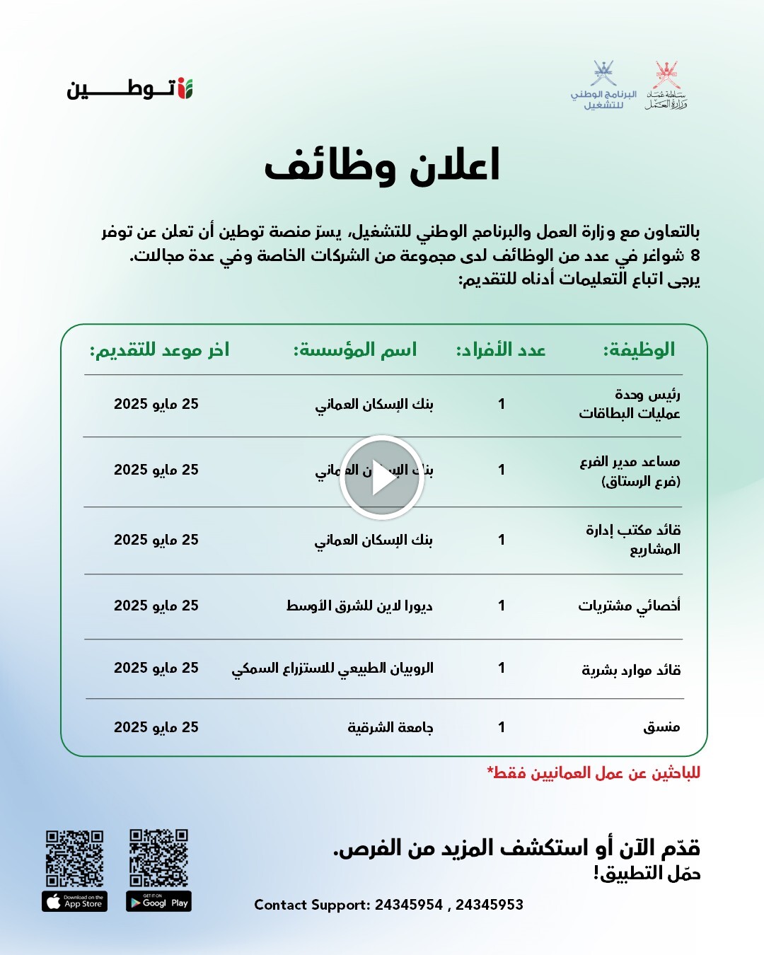 تعلن منصة توطين بالتعاون مع وزارة العمل عن وظائف شاغرة في سلطنة عمان للرجال والنساء الوافدين والمقيمين وفقا للتفاصيل الموضحه ادناه