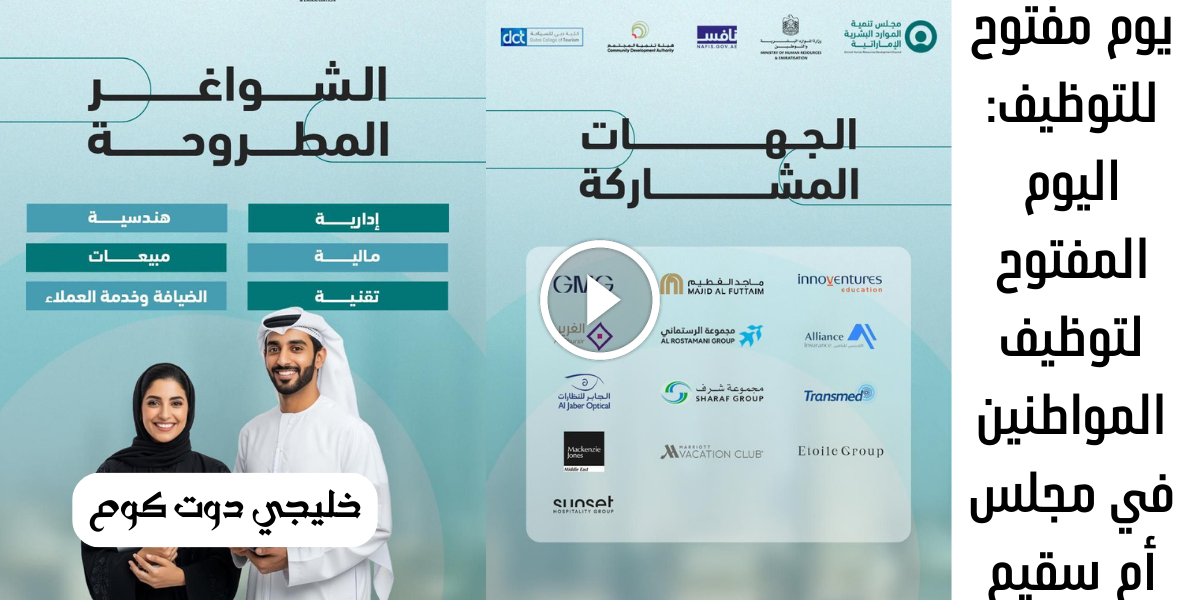 أعلن مجلس أم سقيم عن تنظيم يوم مفتوح للتوظيف في الامارات، يجمع نخبة من أبرز شركات القطاع الخاص، ويتم تنظيمه بالتعاون مع برنامج “نافس” لدعم التوطين، ويتيح فرصًا وظيفية متنوعة في مجالات متعددة، ويستهدف المواطنين من خريجي الثانوية العامة وحملة شهادة البكالوريوس وذلك وفقًا للتفاصيل التالية: