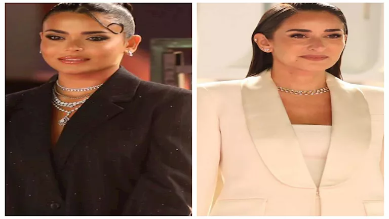 اختارت الفنانة علا رشدي بدلة “أوف وايت” بقصة واسعة مع قميص وربطة عنق بنفس اللون، وأكملت اللوك بمكياج قوي مع أحمر شفاه أحمر ناري، وتسريحة شعر منسدلة على الجانبين.