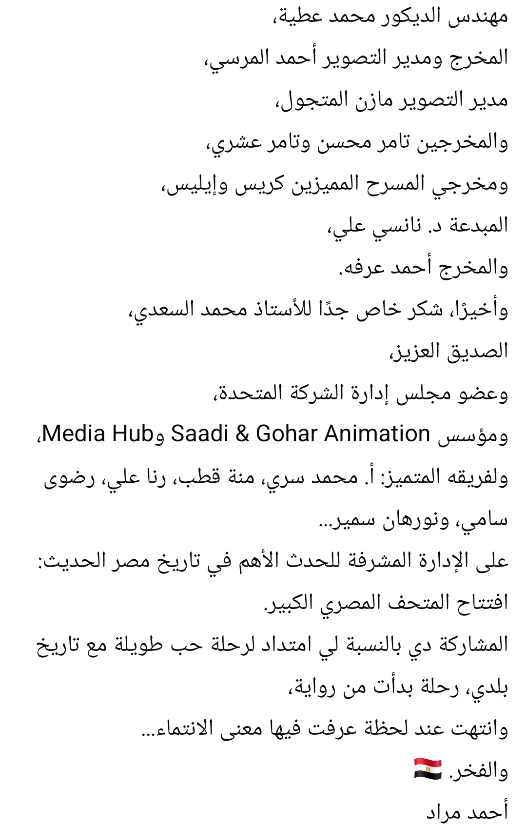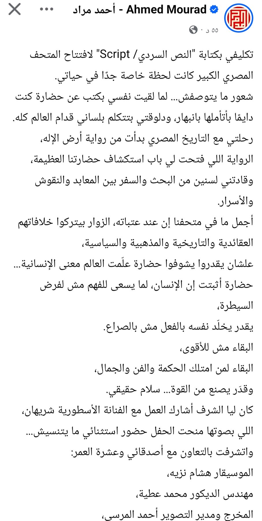 وعلق قائلا: “تكليفي بكتابة “النص السردي/ Script” لافتتاح المتحف المصري الكبير كانت لحظة خاصة جدًا في حياتي، شعور ما يتوصفش.. لما لقيت نفسي بكتب عن حضارة كنت دايمًا بأتأملها بانبهار، ودلوقتي بتتكلم بلساني قدام العالم كله”.