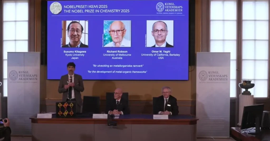 منحت الأكاديمية الملكية السويدية للعلوم، الأربعاء، جائزة نوبل في الكيمياء لعام 2025، إلى الأردني من أصل فلسطيني عمر ياغي، الباحث بجامعة كاليفورنيا في الولايات المتحدة، والبريطاني ريتشارد روبسون، الباحث بجامعة ملبورن في أستراليا، والياباني سوسومو كيتاجاوا، الباحث بجامعة كيوتو في اليابان “لتطويرهم أطراً معدنية عضوية”.