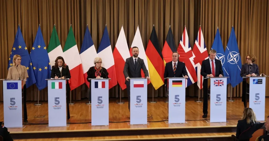 واجتمع وزراء دفاع دول مجموعة الخمس الأوروبية E5 التي تضم أكبر الدول من حيث الإنفاق العسكري في القارة، وهي فرنسا وألمانيا، وإيطاليا وبولندا وبريطانيا، في إطار جهود قادة أوروبيين لتعزيز القدرات الدفاعية، وسط تزايد الشكوك الأوروبية حول التزام واشنطن بحماية القارة.