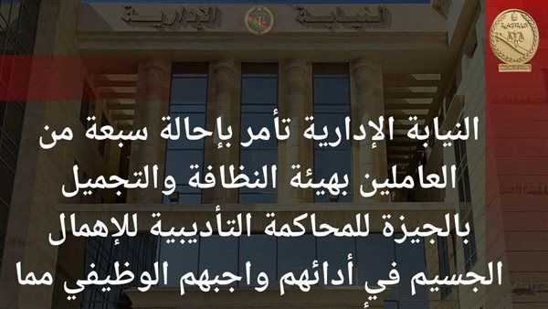 أمر المستشار محمد الشناوي رئيس هيئة النيابة الإدارية، بإحالة سبعة من العاملين بالهيئة العامة للنظافة والتجميل بمحافظة الجيزة للمحاكمة التأديبية؛ وذلك على خلفية إهمالهم الجسيم في واجبات وظيفتهم وارتكابهم عددًا من المخالفات المالية والإدارية بأحد المشروعات الكبرى التي تباشرها الهيئة بالشراكة مع إحدى الشركات الأجنبية؛ مما كان من شأنه إضعاف المركز القانوني للدولة وتكبدها أعباءً ماليةً جسيمة قدرت بمبلغ “١٣ مليون يورو” لصالح الشريك الأجنبي نظير التسوية التحكيمية المتعلقة بالأضرار المالية لهذا الشريك من جراء المخالفات التي شابت إجراءات التعاقد وتنفيذه.