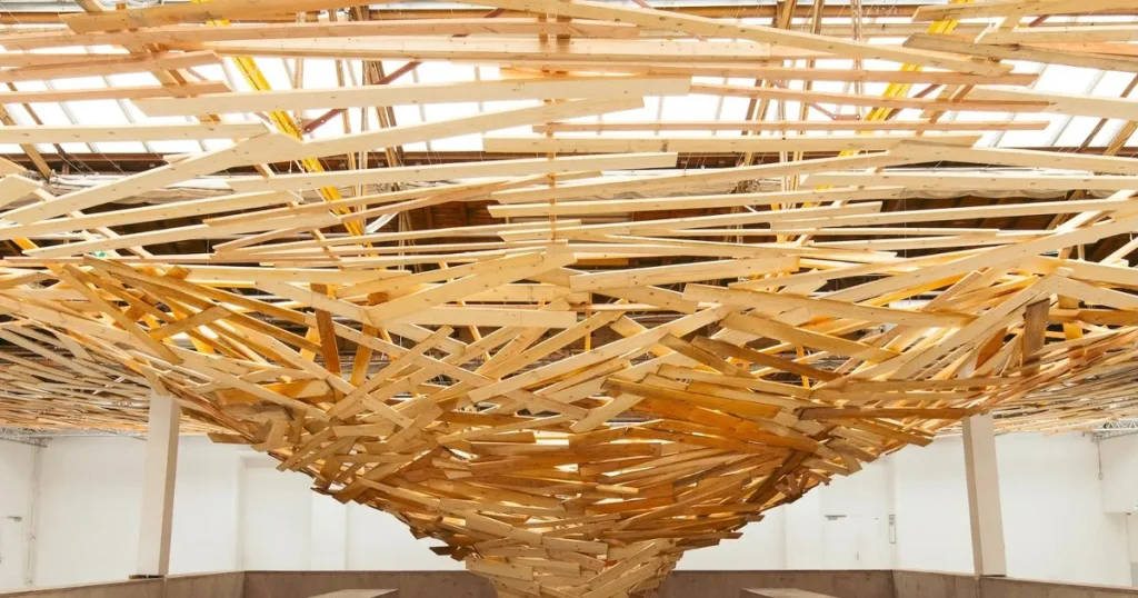 يقدّم الفنان تجربة غامرة تثير تساؤلات حول علاقتنا بالمكان والزمان والطبيعة. توحي الألواح المرتبة بنمط غير منتظم، بحركة حلزونية، وقوة دائرية جاهزة لابتلاع الفضاء. يقف المشاهد في قلب العاصفة الخشبية، وكأن الإعصار يتحول من شرنقة واقية للعصافير إلى انفجار هائل من الطاقة.
