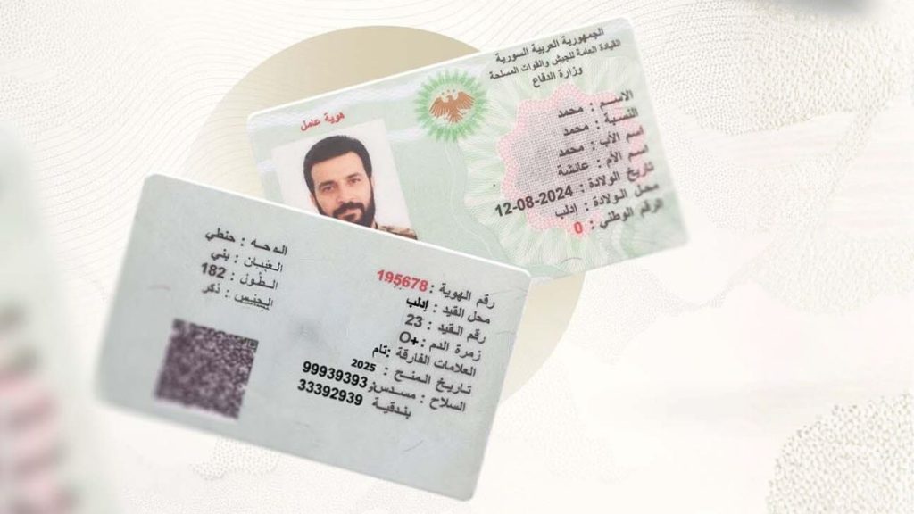 وفي حزيران الماضي، كشف المسؤول في المكتب الإعلامي لوزارة الدفاع السورية، أن الوزارة ستصدر بطاقات تعريف عسكرية جديدة متطورة، تتضمن بيانات شخصية ورقمية مشفرة، ضمن مواصفات تقنية تُسهم في تعزيز الموثوقية والهوية المؤسسية للعناصر العسكرية.