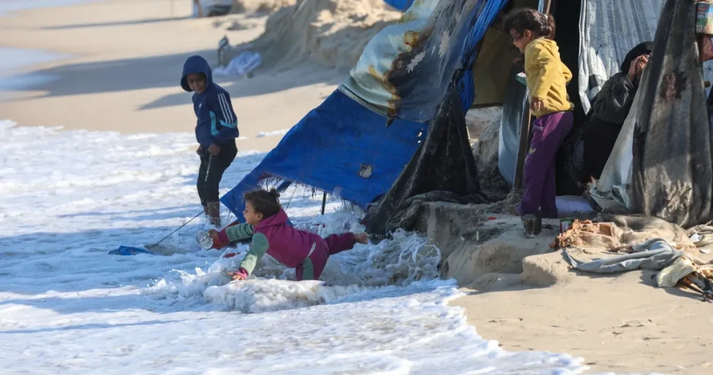 ويواجه النازحون في غزة وضعاً بالغ الصعوبة بسبب منخفض جوي عاصف تصاحبه رياح شديدة وأمطار غزيرة، بالتزامن مع انخفاض درجات الحرارة إلى حد الصقيع.