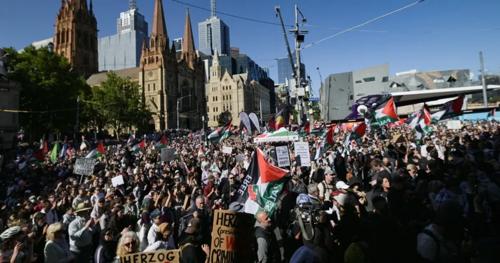 وفي الحي التجاري المركزي لملبورن، تجمع حشد كبير منذ مساء الخميس خارج إحدى محطات القطار الرئيسية في المدينة. وارتدى كثير من المتظاهرين الكوفية ولوّحوا بالأعلام الفلسطينية.