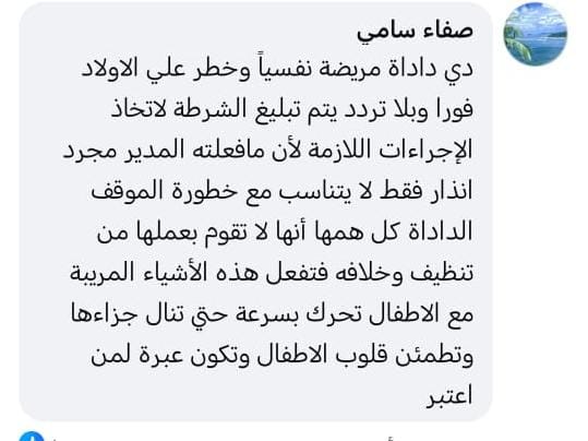 وأضافت أن طفلتها خرجت في حالة انهيار لتجد “الدادة” واقفة أمام الحمام وتنظر إليها “بنظرات مخيفة” موجهة لها تهديدًا لفظيًا +حسب قولها