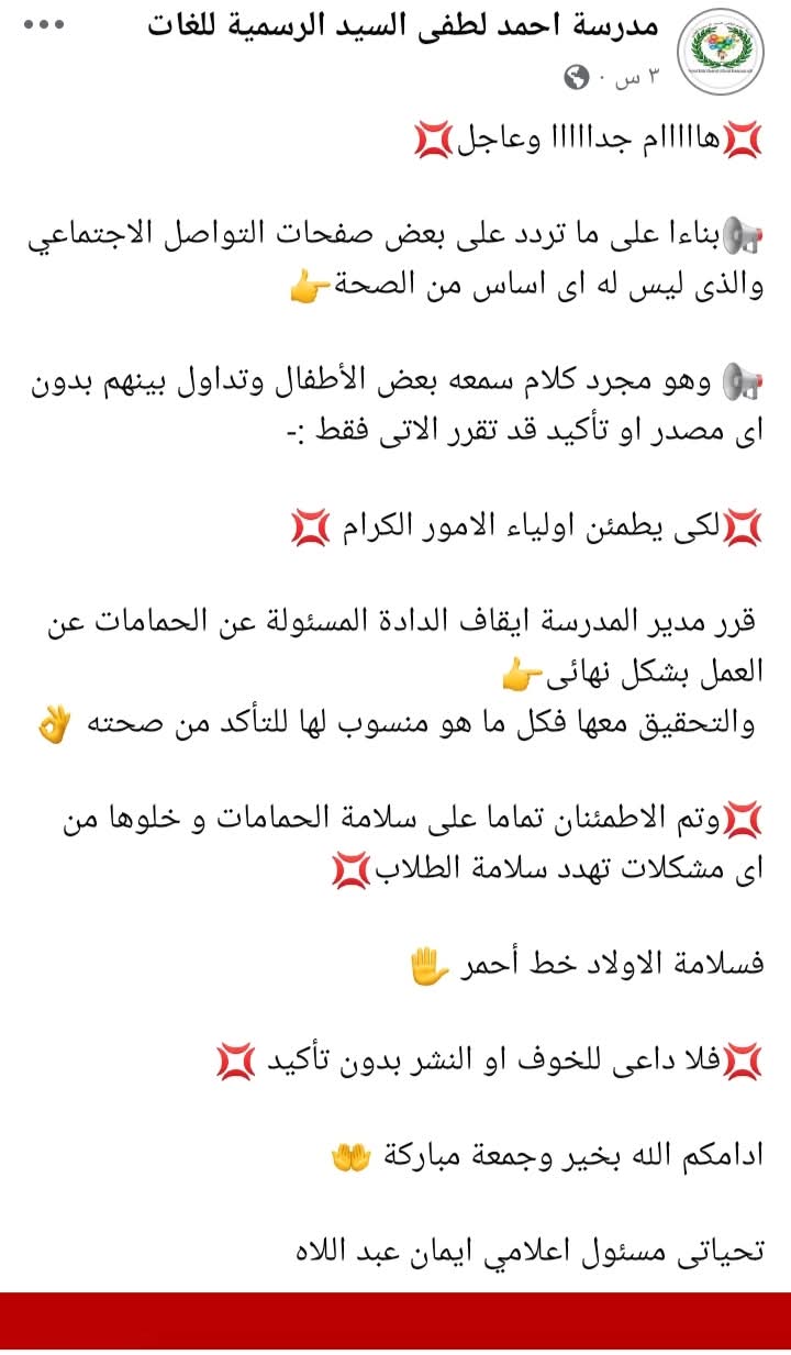 في المقابل، أصدرت إدارة مدرسة أحمد لطفي السيد الرسمية للغات بيانًا عاجلًا نفت فيه نفيًا قاطعًا صحة ما جرى تداوله، مؤكدة أن المنشور يتضمن روايات “لا أساس لها من الصحة”، وأن ما حدث “مجرد كلام متداول بين الأطفال دون أي واقعة مثبتة أو مصدر يؤكده”.