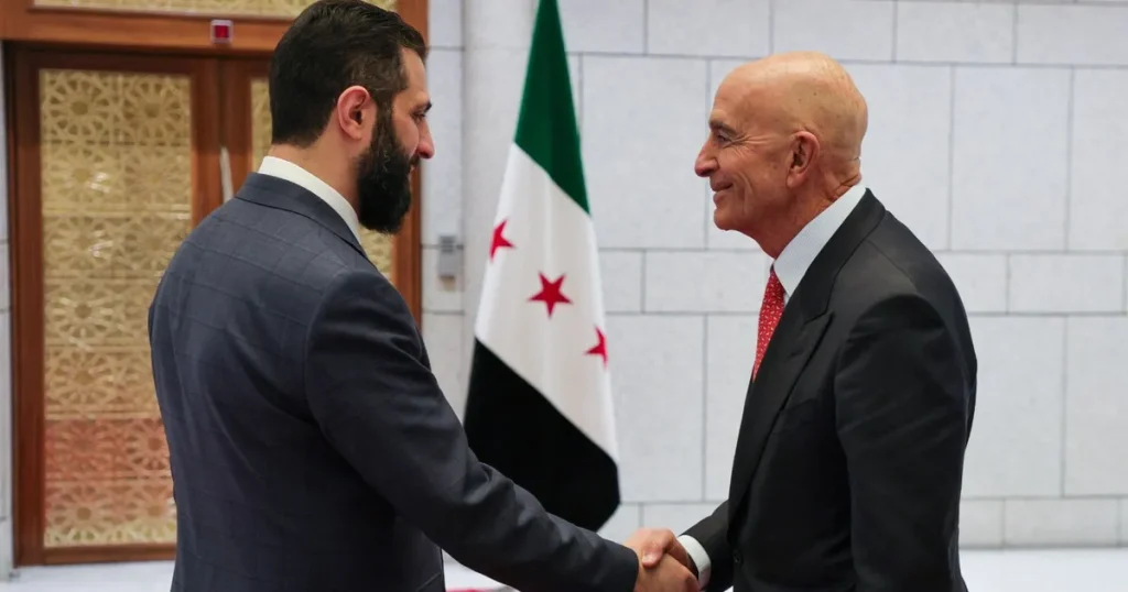 وحضر لقاء الشرع مع المبعوث الأميركي، وفق وكالة الأنباء السورية “سانا”، قائد القيادة المركزية الأميركية، براد كوبر، ووزير الخارجية السوري، أسعد الشيباني، ووزير الدفاع، مرهف أبو قصرة، ورئيس جهاز الاستخبارات العامة، حسين السلامة.