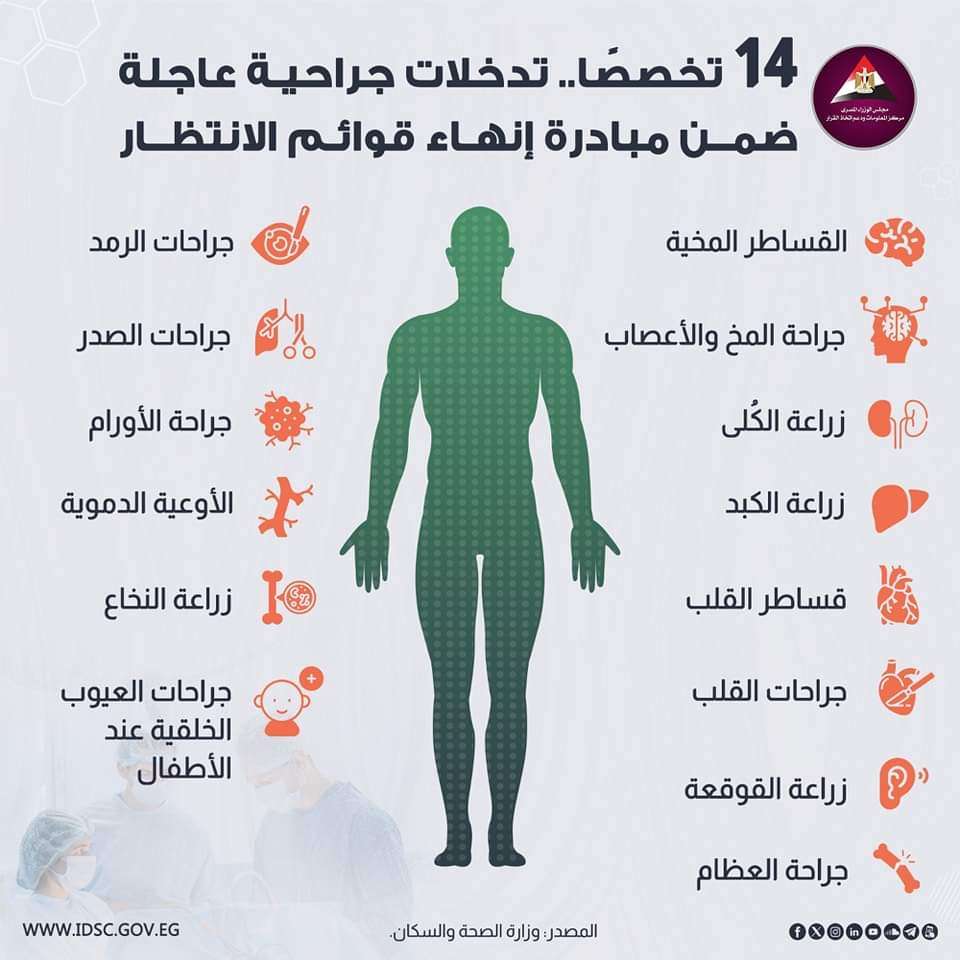 شاركها فيسبوك تويتر لينكدإن بينتيريست تيلقرام البريد الإلكتروني أعلنت وزارة الصحة والسكان أن هناك 14 تخصصًا طبيًّا تُقدِّم بها التدخلات الجراحية العاجلة ضمن مبادرة رئيس الجمهورية لإنهاء قوائم الانتظار المصدر: بلدنا اليوم