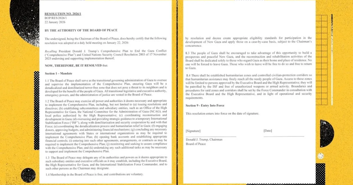 يقرّ الموقّع أدناه، بصفته رئيس “مجلس السلام”، بأن القرار الآتي قد اعتُمد في اجتماع رسمي عُقد بتاريخ 22 يناير 2026.