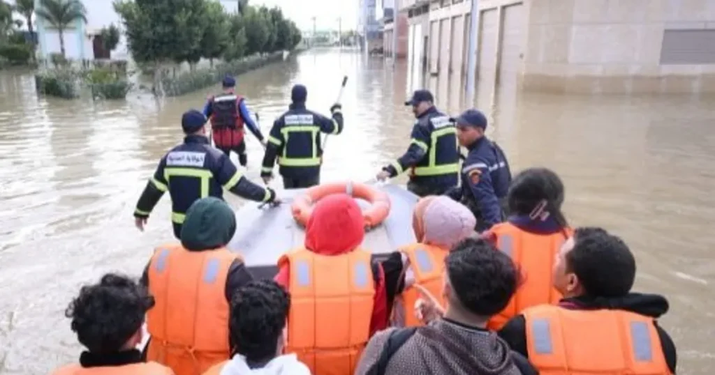 وقال مسؤولون إن الفيضانات نجمت في جزء منها عن المياه التي تم إطلاقها من سد واد المخازن القريب، الذي بلغ طاقته الاستيعابية القصوى.