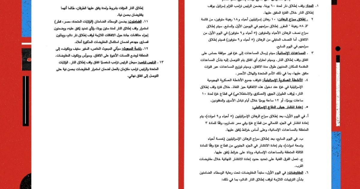 11- الضامنون: يضمن الوسطاء الضامنون (الولايات المتحدة، مصر، قطر) استمرار وقف إطلاق النار لمدة 60 يوما، ويضمنون استمرار المفاوضات حتى التوصل لاتفاق وقف إطلاق النار الدائم، مع استمرار وقف العمليات العسكرية ودخول المساعدات الإنسانية.