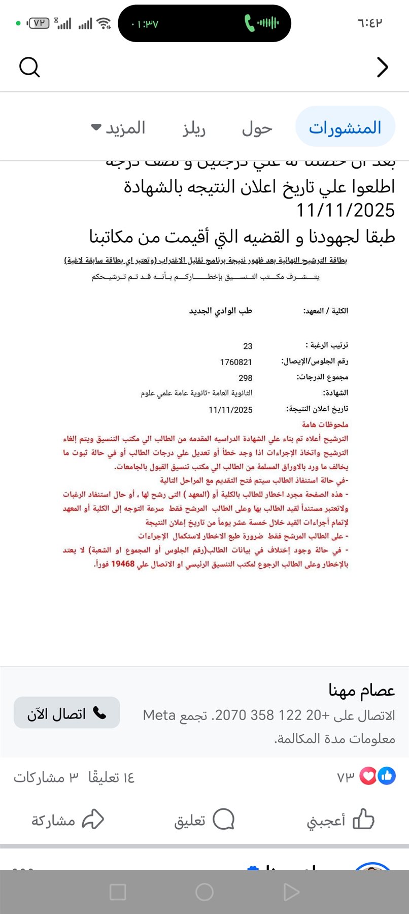 وأشار إلى أن تاريخ إعلان النتيجة المدون على الشهادة جاء في 11 نوفمبر 2025، أي بعد انتهاء تنسيق الجامعات بفترة طويلة، وهو ما تسبب في تأخر التحويل الجامعي إلى منتصف الفصل الدراسي الأول.