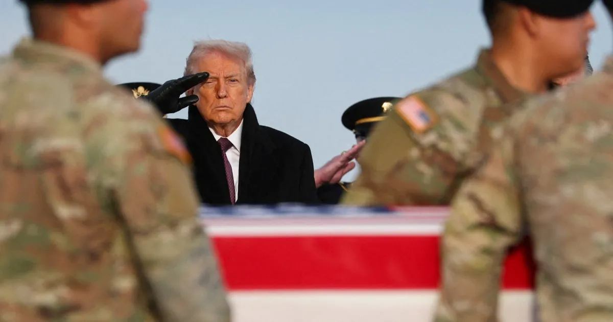 وفي يوم بارد وعاصف، وقف ترمب وهيجسيث وآخرون قرب باب طائرة نقل تابعة لسلاح الجو، وأدّوا التحية العسكرية بينما كان جنود يرتدون قفازات بيضاء يحملون النعوش تباعاً، ويضعونها في سيارة كانت تنتظرهم.