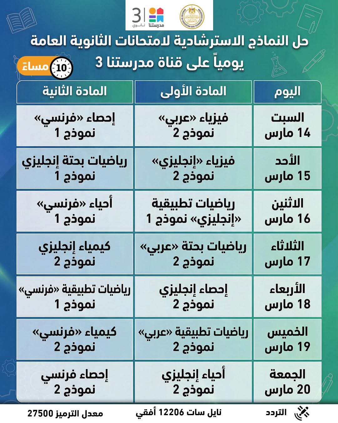وفي هذا الإطار، تشير وزارة التربية والتعليم إلى أنه سيتم اتاحة نموذج استرشادي لكل مادة بالتتابع على موقع الوزارة يوميا في تمام الساعة ٩ مساء وفقا للجداول المعلنة والتي تمتد حتى شهر مايو المقبل بالتوازي مع إتاحة حل النماذج عبر قناة “مدرستا ٣” عبر سلسلة من الحلقات التي سيتم إذاعتها يوميا في تمام الساعة العاشرة مساء على أن تكون الإعادة في تمام الساعة ١٢ ظهر اليوم التالي.