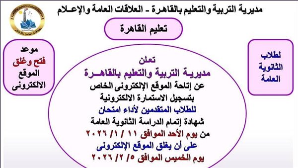 أعلنت مديرية التربية والتعليم بالقاهرة إتاحة الموقع الإلكتروني الخاص بتسجيل الاستمارة الإلكترونية للطلاب المتقدمين لأداء امتحان شهادة إتمام الدراسة الثانوية العامة، وذلك اعتبارًا من يوم الأحد الموافق 11/1/2026.