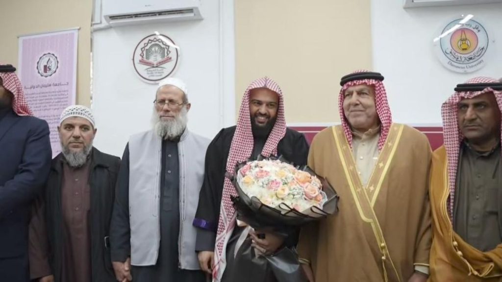 وتداولت وسائل التواصل الاجتماعي تسجيلات مصورة وصورًا تظهر مناقشة أطروحة دكتوراه لـ”الداعية السعودي عبد الله المحيسني”، المدرج على قوائم إرهاب عربية ودولية، داخل أروقة كلية الشريعة بجامعة دمشق، في 14 من كانون الثاني.