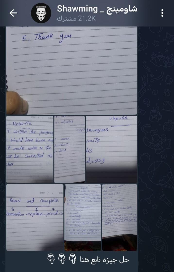 تداولت جروبات الغش الإلكتروني، صباح اليوم الأحد 18 يناير، في ثاني أيام امتحانات الشهادة الإعدادية، صورًا لامتحان اللغة الإنجليزية للفصل الدراسي الأول بمحافظة الجيزة، بعد نحو 40 دقيقة من بدء اللجنة.
