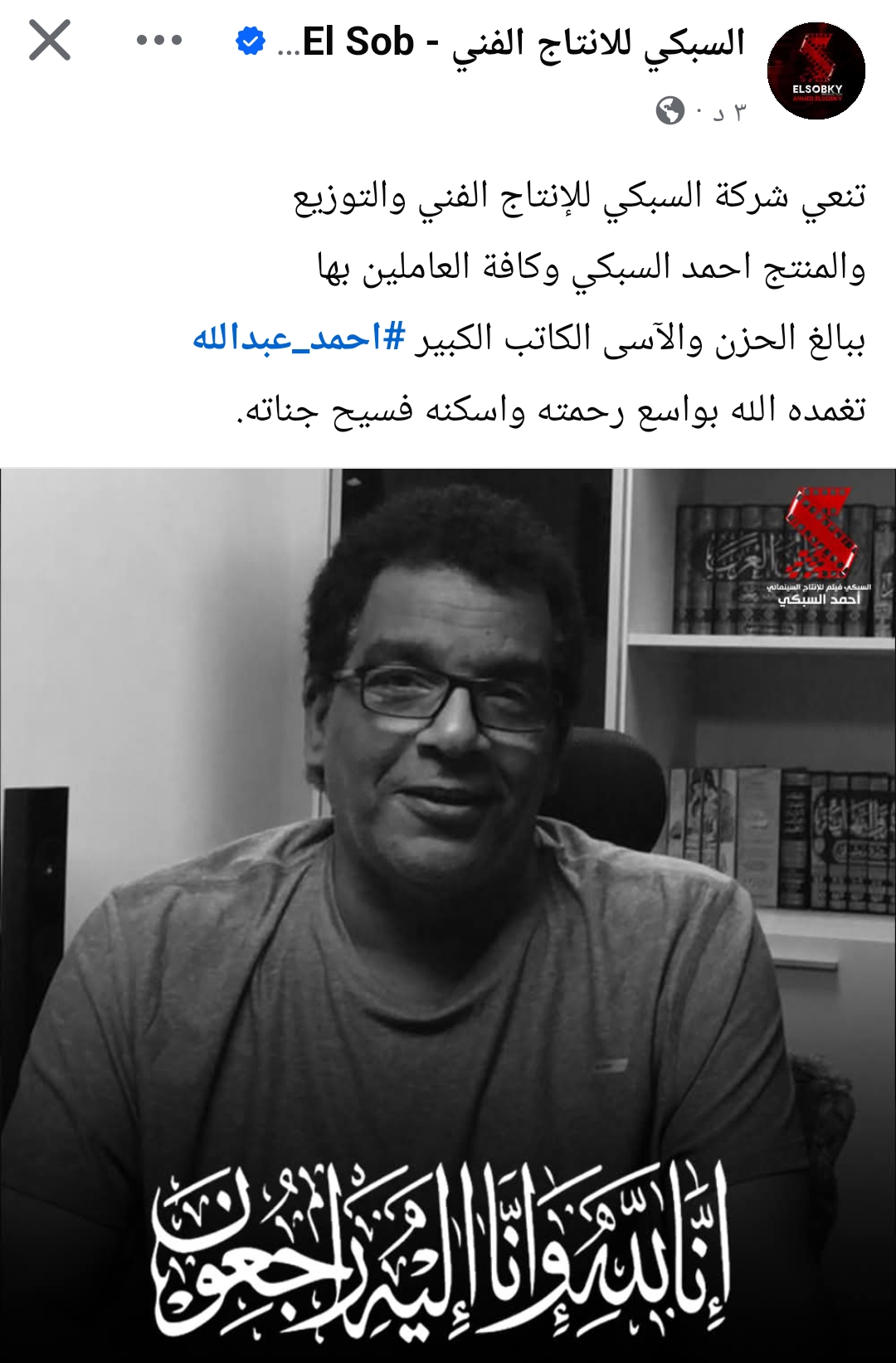 كما نعت شركة السبكي، المؤلف أحمد عبدالله، حيث كتبت الصفحة الرسمية لشركة السبكي، عبر حسابهم الشخصي بموقع التواصل الاجتماعي فيسبوك: “تنعي شركة السبكي للإنتاج الفني والتوزيع، والمنتج أحمد السبكي وكافة العاملين بها ببالغ الحزن والآسى الكاتب الكبير أحمد عبدالله، تغمده الله بواسع رحمته واسكنه فسيح جناته”.