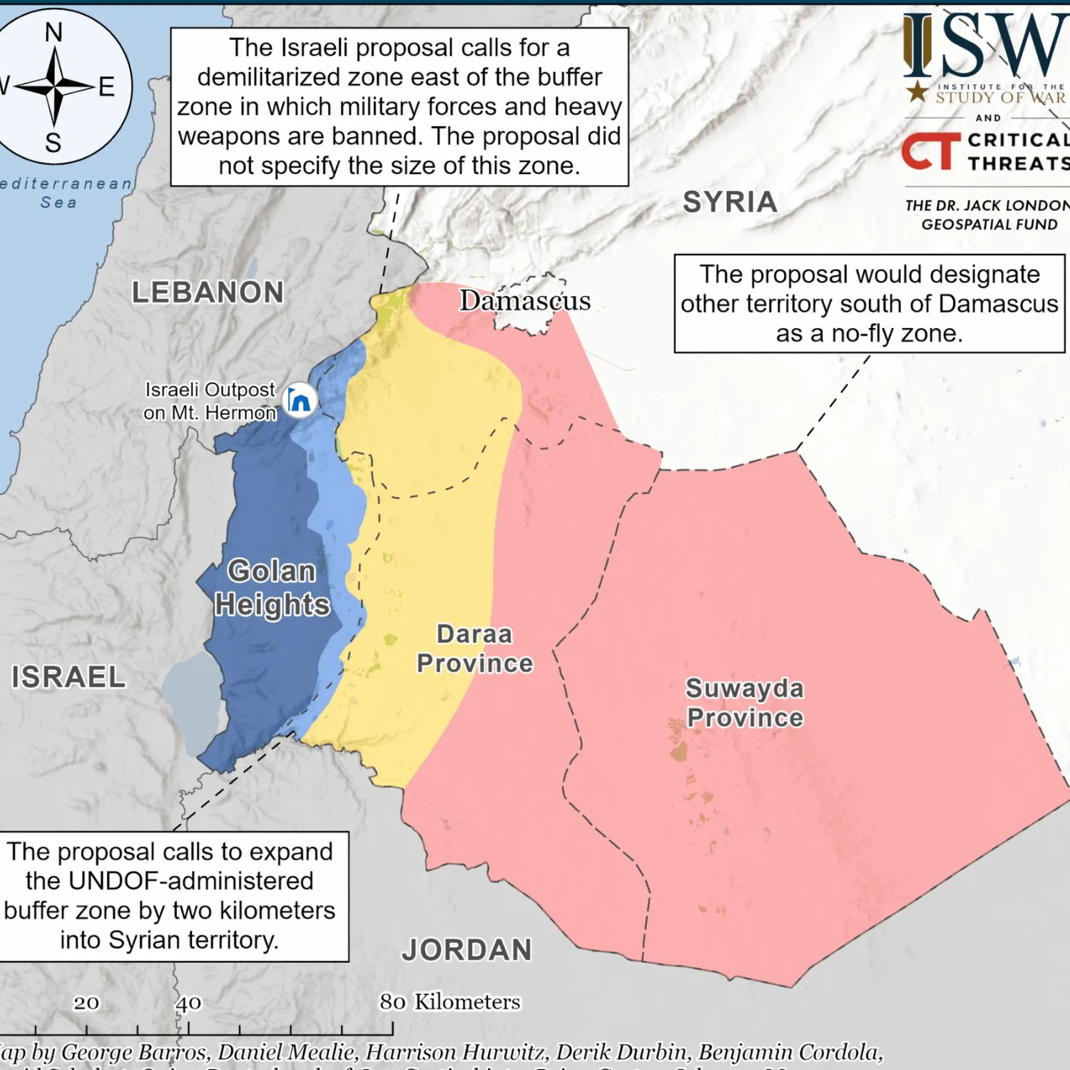 نشر مركز “دراسات الحرب” الأمريكي، خريطة لما قال إنه المقترح الإسرائيلي بشأن المنطقة منزوعة السلاح في سوريا: