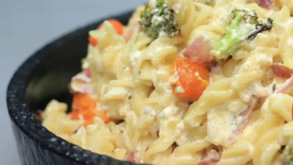 تضاف مكرونة مسلوقة , كريمة طهي و تقلب مع باقى المكونات