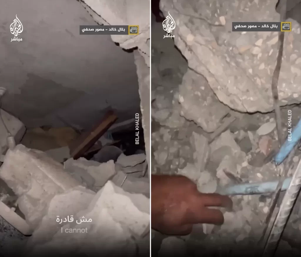 ففي مقطع الفيديو، يُسمع صوت الفتاة الفلسطينية وهي تصرخ وتستغيث من تحت الأنقاض قائلة طلعوني أمانة، فيما طمأنها أحد رجال الإنقاذ بأنهم قادمون إليها.