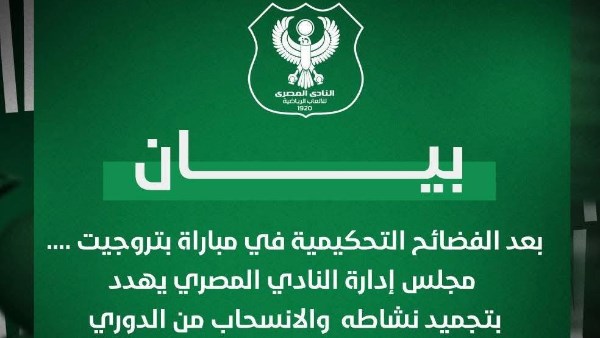 وكتب الإعلامي أحمد عبد الباسط عبر حسابه علي موقع التواصل الاجتماعي فيسبوك :”المصري البورسعيدي يهدد بتجميد النشاط والانسحاب من الدوري”.