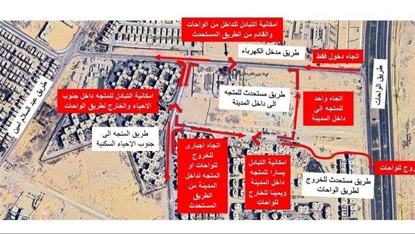 أولًا: للقادم من طريق الواحات: الدخول عبر شارع الكهرباء سيكون (اتجاه واحد فقط للدخول) وعند الوصول لمنطقة المناورة بعد الطريق المستحدث، يمكن للسائق الاختيار بين استكمال المسار حتى طريق “عبد السلام أمين” أو الاتجاه يسارًا للدخول لمنطقة “جنوب الأحياء وأبو الوفا”.