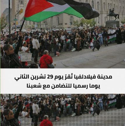 بنسلفانيا 21-11-2025 – أقرّ مجلس مدينة فيلادلفيا في ولاية بنسلفانيا الأميركية يوم التاسع والعشرين من تشرين ثاني/ نوفمبر من كل عام يوما للتضامن مع شعبنا، ليصبح هذا التاريخ مناسبة رسمية في أجندة المدينة.