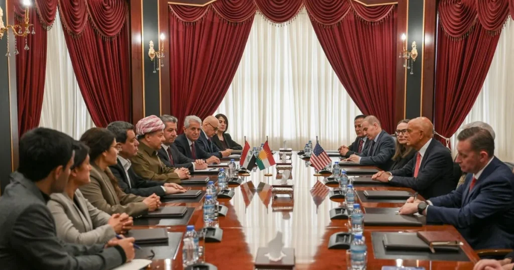 وأوضح البيان أن بارزاني استضاف “اجتماعاً مهماً بين المبعوث الخاص للرئيس الأميركي لشؤون سوريا توم باراك، والقنصل العام الأميركي في أربيل ويندي جرين، وقائد القوات الأميركية في سوريا كيفن لامبارت، والكولونيل زاكاريا كورك، وقائد قوات سوريا الديمقراطية مظلوم عبدي، ورئيس المجلس الوطني الكردي في سوريا (ENKS) محمد إسماعيل”.