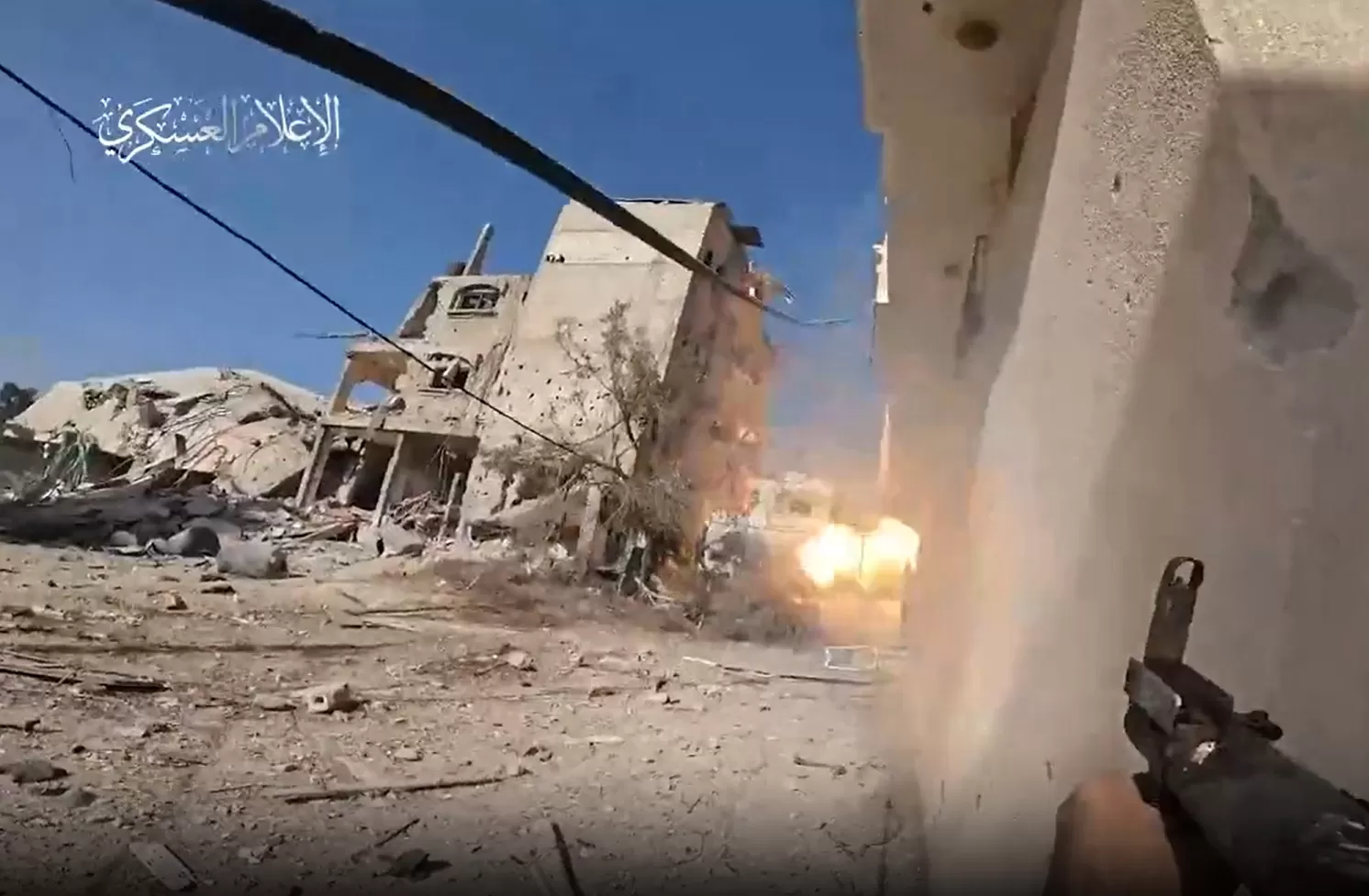 وفي مشهد تال بدا أحد مقاتلي القسام وهو يمد قذيفة من خلف جدار خرساني منهار، ويوجها باتجاه قوات الاحتلال التي بدا عناصرها على بعد عشرات الأمتار ليتحول المكان إلى كتلة من النار.