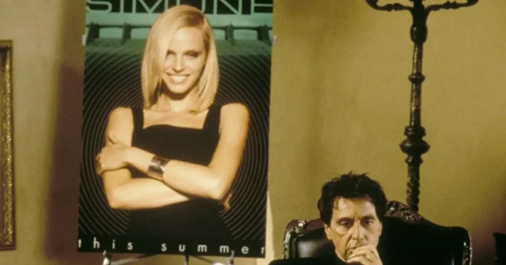 لكن نيكول اختارها عمداً لأنه كانت شبه مجهولة في ذلك الوقت، لكي تُجسّد فكرة الإنسانة التي ليست موجودة أصلًا، أي حضور بلا سيرة، بلا خلفية، وبلا شهرة، وكانت مفارقة ذكية جداً في مستوى التمثيل؛ فـ”سيمون” هي كيان رقمي صُنِع بالكامل بالكمبيوتر وفي الواقع “سيمون”  تؤديها ممثلة حقيقية تُخفي جسدها خلف واجهة رقمية متخيلة.