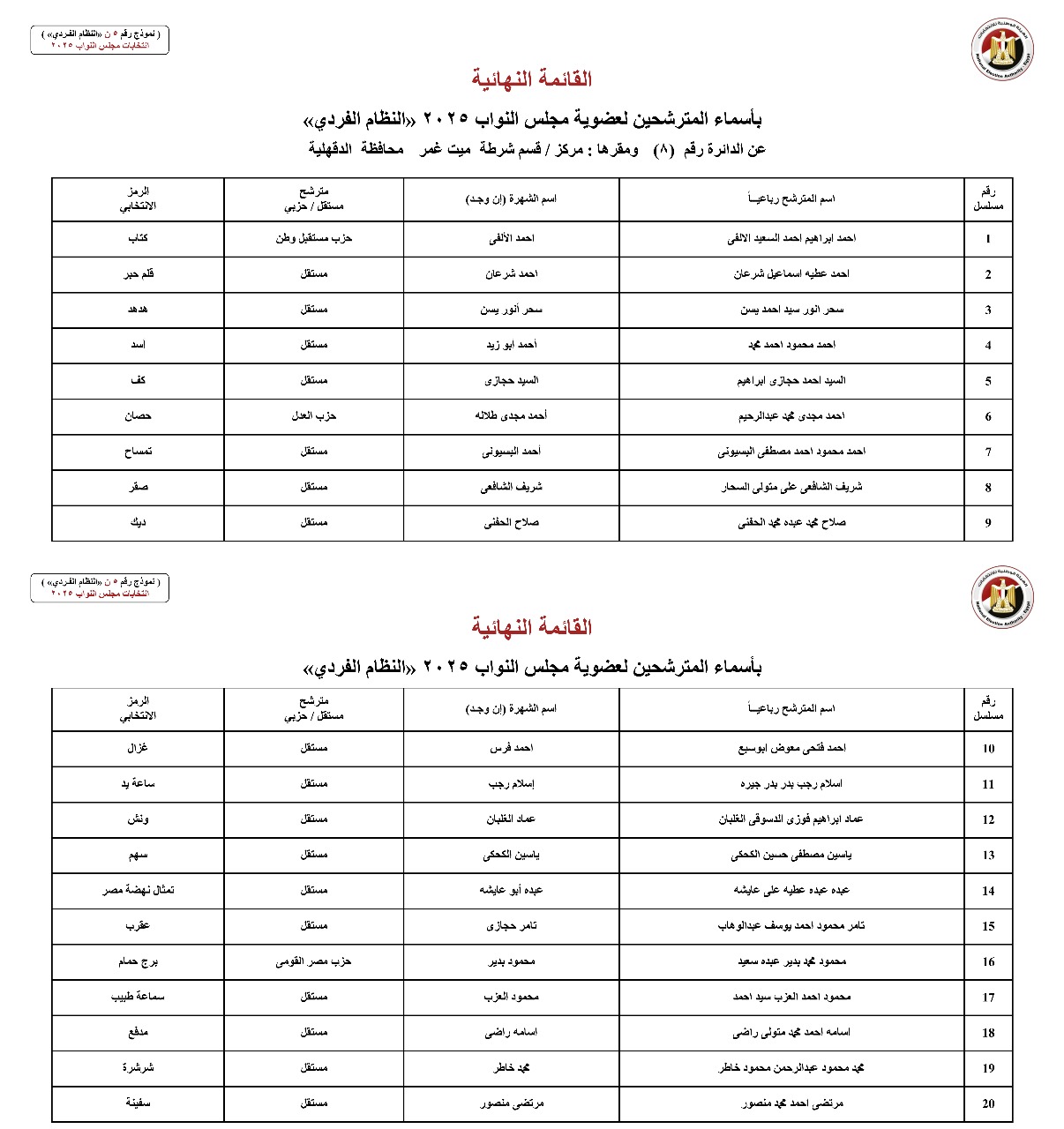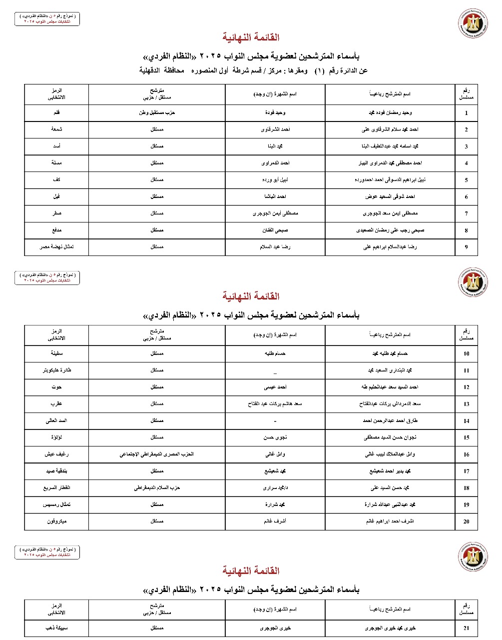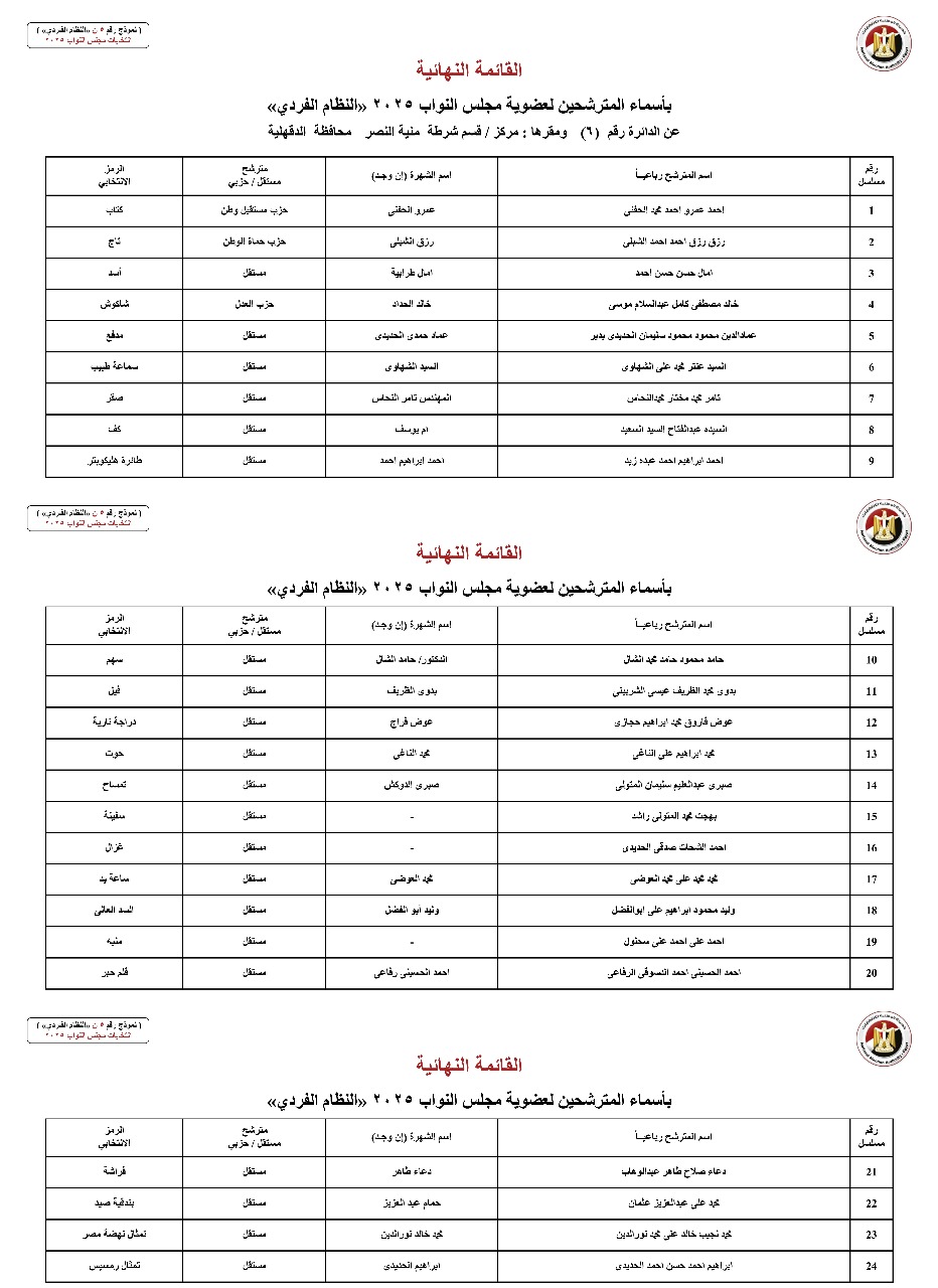 شاركها فيسبوك تويتر لينكدإن بينتيريست تيلقرام البريد الإلكتروني أعلنت الهيئة الوطنية للانتخابات، القائمة النهائية بأسماء المرشحين لعضوية مجلس النواب 2025 بالنظام الفردي في جميع المحافظات. وتستعرض “” خلال السطور التالية أسماء المرشحين في دوائر محافظة الدقهلية.