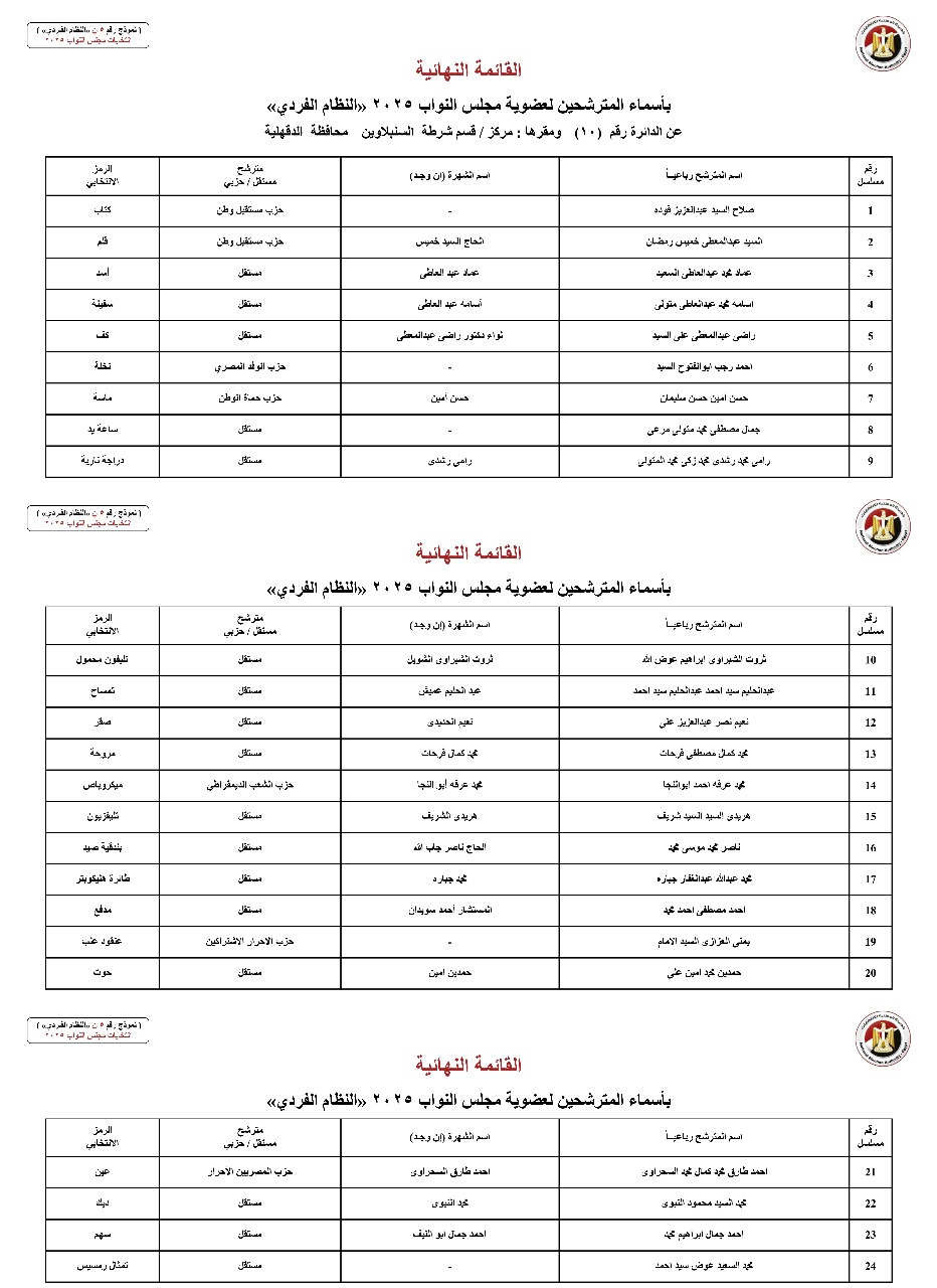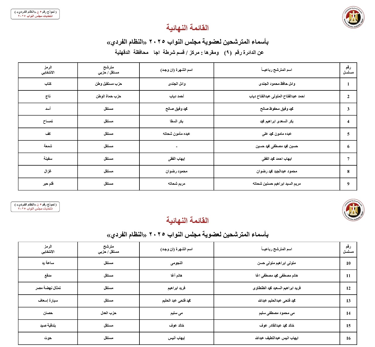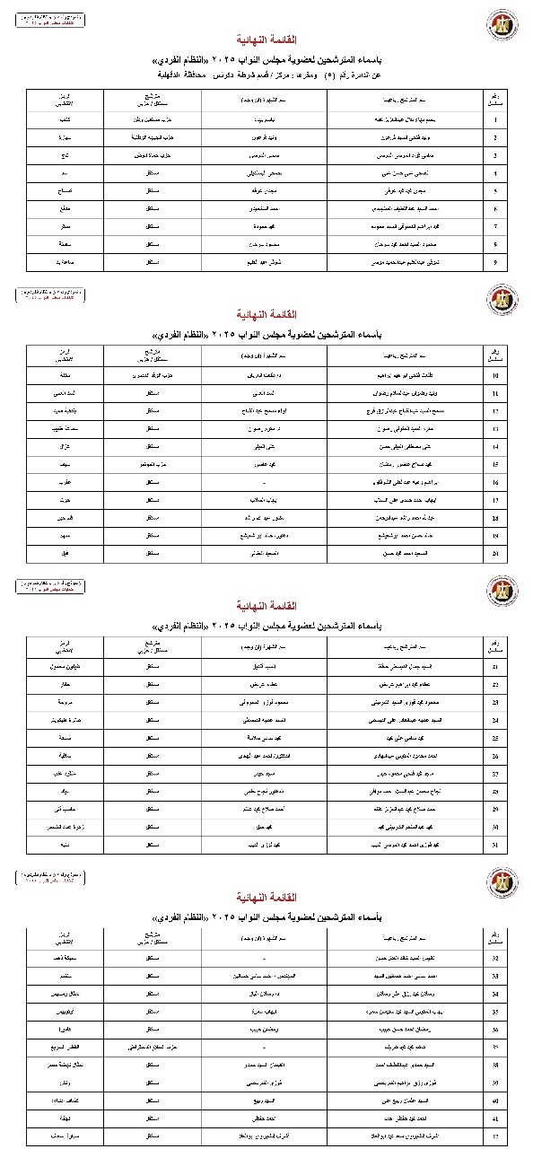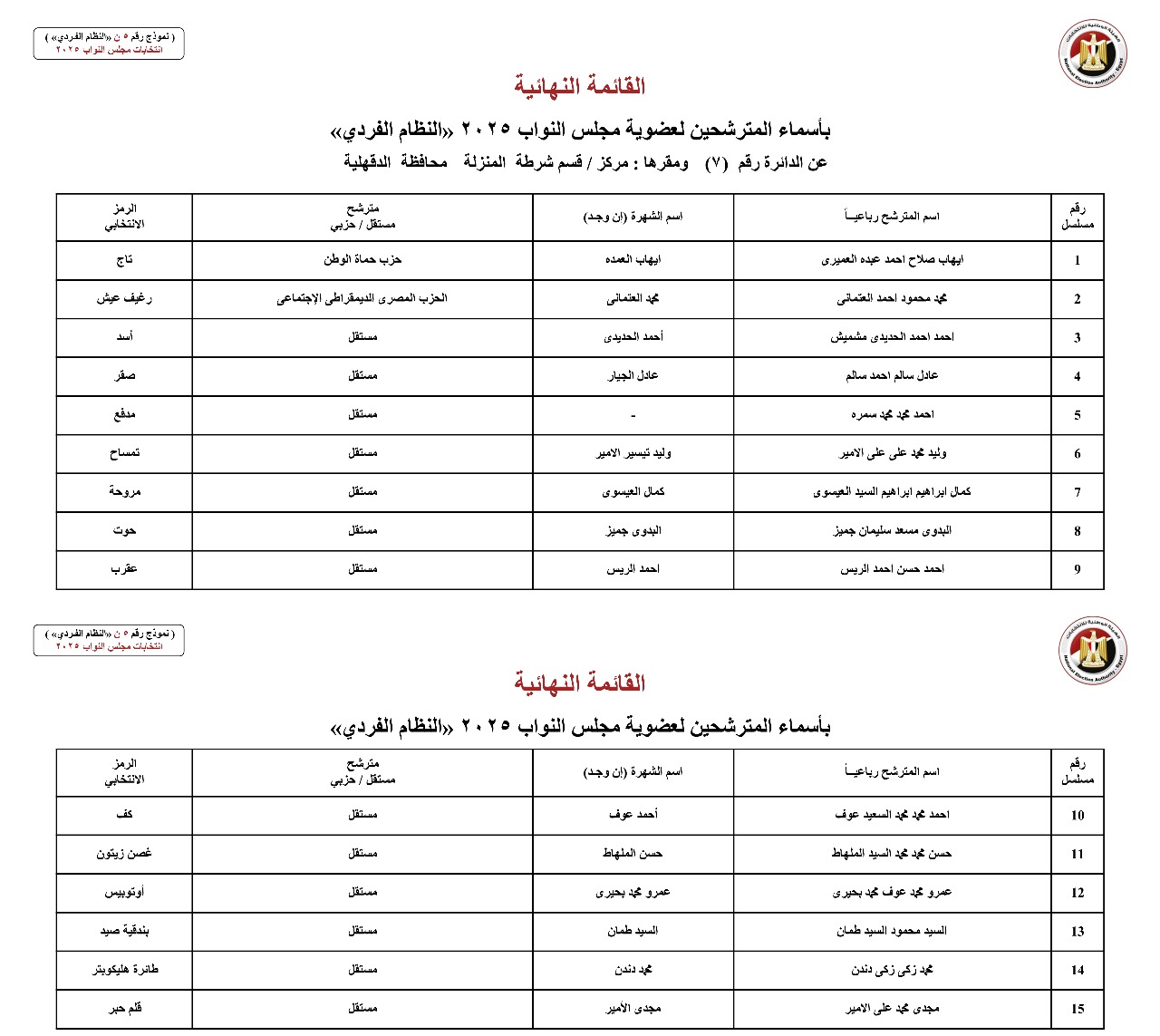 شاركها فيسبوك تويتر لينكدإن بينتيريست تيلقرام البريد الإلكتروني أعلنت الهيئة الوطنية للانتخابات، القائمة النهائية بأسماء المرشحين لعضوية مجلس النواب 2025 بالنظام الفردي في جميع المحافظات. وتستعرض “” خلال السطور التالية أسماء المرشحين في دوائر محافظة الدقهلية.
