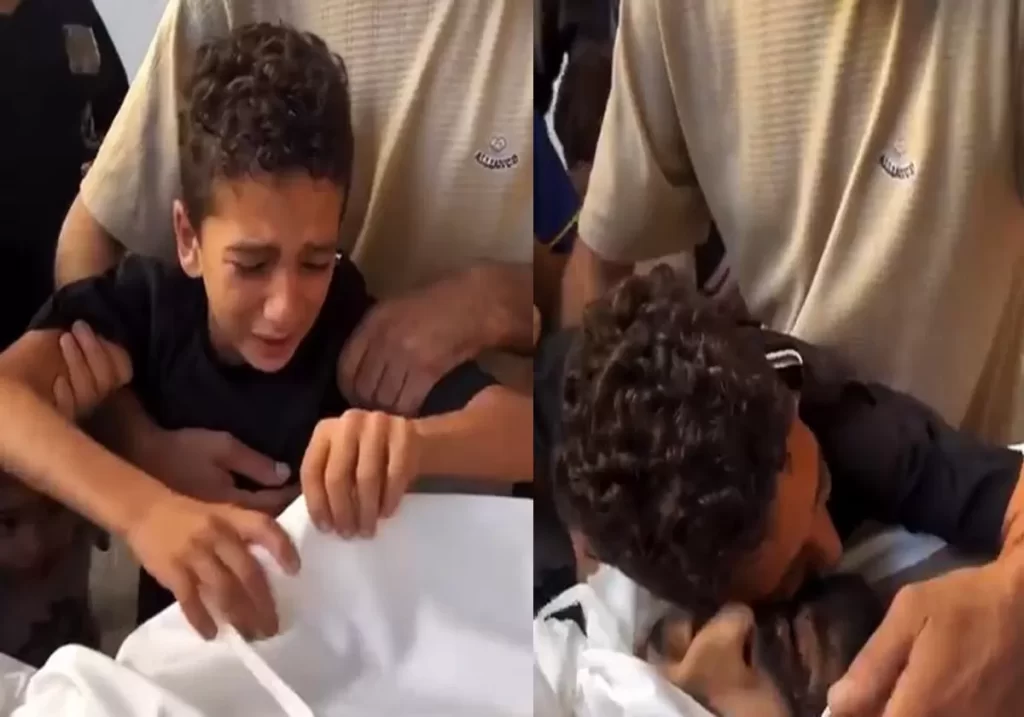 ويظهر في مقطع الفيديو المتداول عبر منصات التواصل الاجتماعي، لحظات إلقاء طفل فلسطيني نظرة الوداع الأخيرة على والده الشهيد جراء قصف الاحتلال خلال حربه المستمرة على غزة.