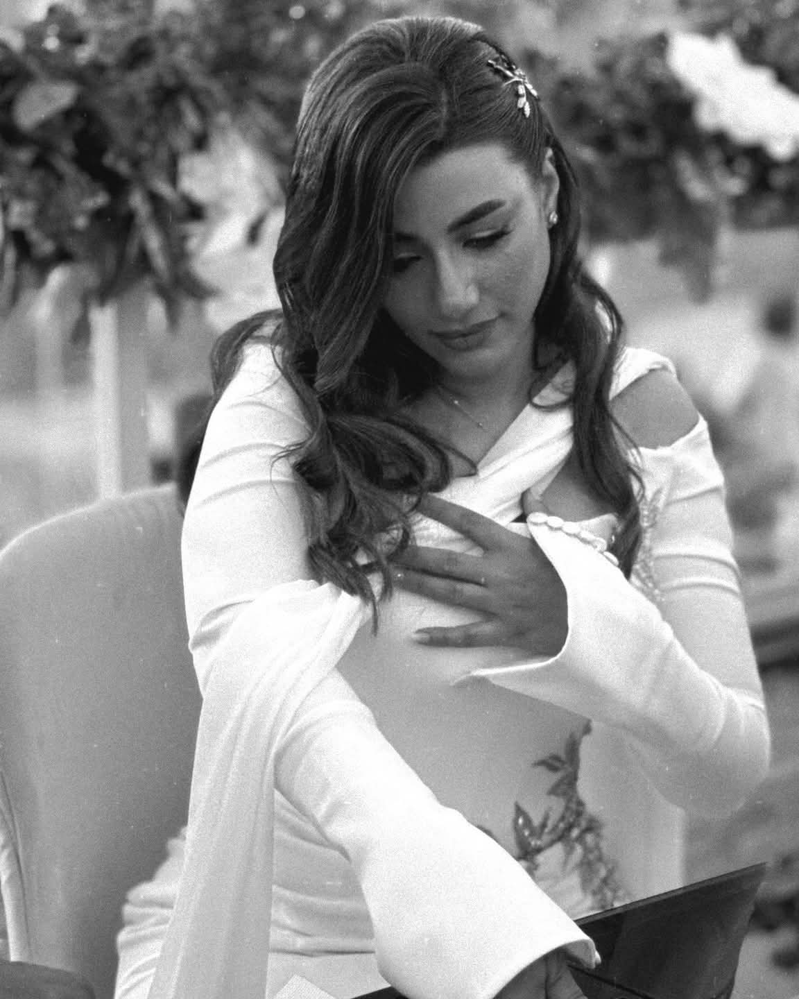 اختارت «هايدي» فستانًا بسيطًا باللون الأبيض، له أكمام طويلة، ومُطرز بتطريزات باللون الذهبي، وارتدى عريسها بدلة باللون الأبيض أيضًا.