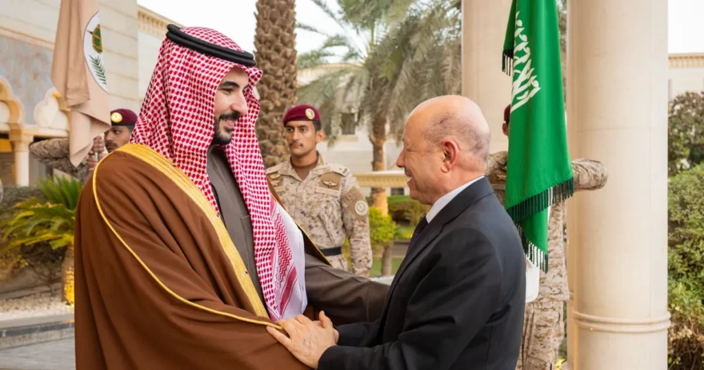 التقى وزير الدفاع السعودي الأمير خالد بن سلمان، في العاصمة الرياض، الأربعاء، رئيس مجلس القيادة الرئاسي اليمني رشاد العليمي وعدد من أعضاء المجلس، لبحث تطورات الأوضاع في اليمن، والمساعي الهادفة لإنهاء الأزمة اليمنية ضمن الحل السياسي الشامل في اليمن لتحقيق الأمن والاستقرار، بحسب وكالة الأنباء السعودية “واس”.