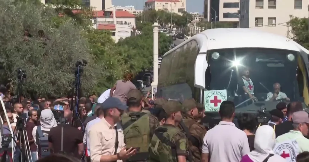 شاركها فيسبوك تويتر لينكدإن بينتيريست تيلقرام البريد الإلكتروني وصلت إلى رام الله حافلات الصليب الأحمر التي تقل الأسرى الفلسطينيين المفرّج عنهم من سجن عوفر الإسرائيلي، ضمن اتفاق وقف الحرب في غزة. عملية النقل تمت تحت إشراف الصليب الأحمر والتسليم الرسمي للسلطات الفلسطينية.