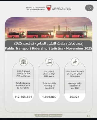 كشفت إحصائيات رسمية صادرة عن الجهات المختصة في قطاع النقل العام أن إجمالي عدد رحلات النقل العام خلال شهر نوفمبر 2025 بلغ 1,059,800 رحلة، بمعدل متوسط يومي وصل إلى 35,326 رحلة يومياً رحلة، ما يعكس الاعتماد المتزايد على خدمات النقل العام في مملكة البحرين.
