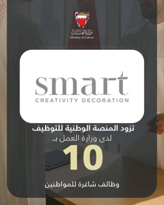 في إطار تنفيذ توجيهات صاحب السمو الملكي الأمير سلمان بن حمد آل خليفة ولي العهد رئيس مجلس الوزراء، بعرض 3 فرص وظيفية لكل باحث عن عمل مسجل لدى وزارة العمل، الإبداع الذكي للديكور تزود المنصة الوطنية للتوظيف بـ 10 وظائف شاغرة للمواطنين.