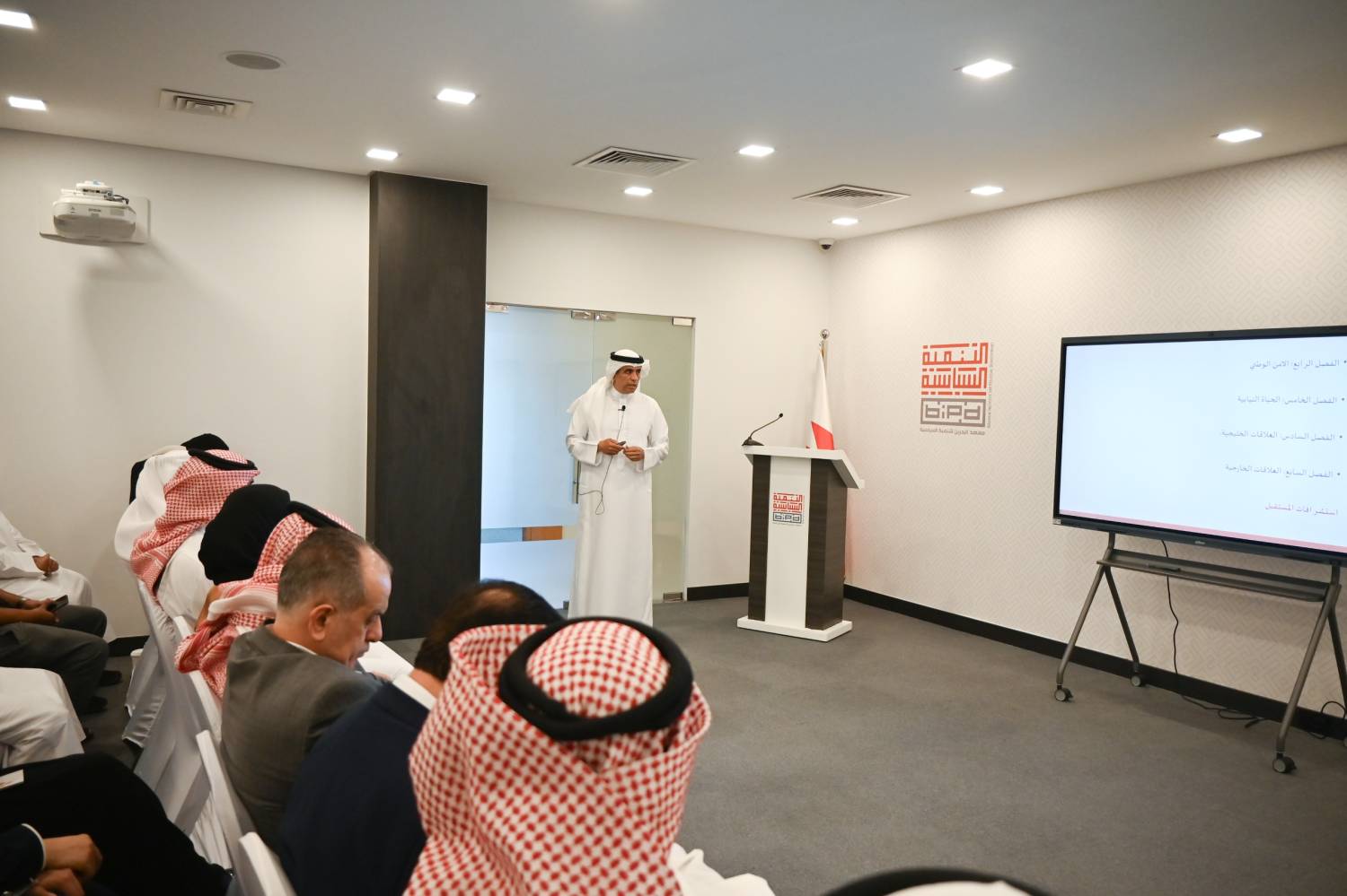 وسلط اللقاء الضوء على معهد البحرين للتنمية السياسية بوصفه أحد أبرز مخرجات ميثاق العمل الوطني، وثمرة مباشرة للمشروع التنموي الشامل، حيث تأسس ليكون معهدًا وطنيًا متخصصًا في نشر الثقافة السياسية، وتعزيز الوعي الدستوري، وتأهيل الكوادر الوطنية للمشاركة الإيجابية في الحياة العامة.