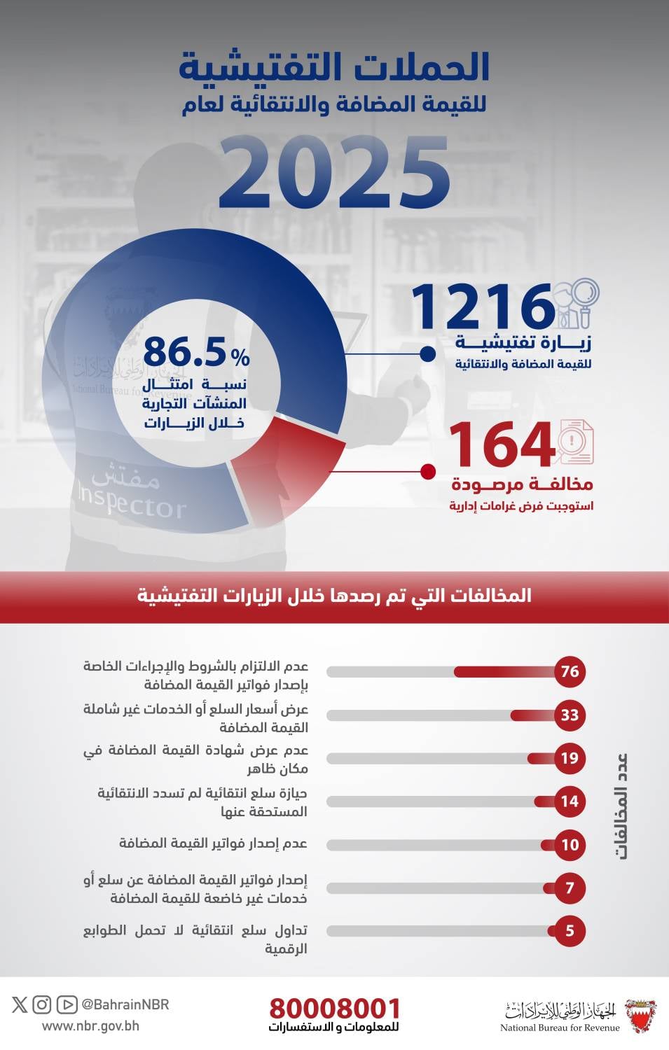 في إطار الجهود الحثيثة لتعزيز التطبيق السليم والامتثال للقيمة المضافة والانتقائية، قام الجهاز الوطني للإيرادات بتنفيذ 1216 زيارة تفتيشية في جميع محافظات مملكة البحرين خلال عام 2025، حيث شملت هذه الزيارات مختلف القطاعات بما في ذلك البناء، والتصنيع، والعقارات، والبيع بالتجزئة، وتركيب السباكة والتدفئة وتكييف الهواء، ووكالات السفر، وإصلاح السيارات، وموردي الأيدي العاملة، وتجارة المجوهرات وغيرها من القطاعات.