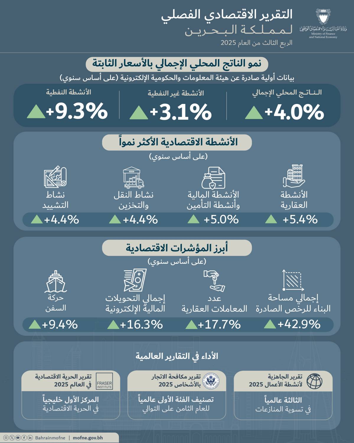 نشرت وزارة المالية والاقتصاد الوطني اليوم التقرير الاقتصادي الفصلي لمملكة البحرين للربع الثالث من عام 2025 عبر موقعها الإلكتروني www.mofne.gov.bh.