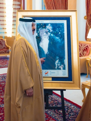 هذا وقدم الشيخ خالد بن علي بن جابر آل خليفة رئيس مجلس إدارة وكالة البحرين للفضاء، والدكتور محمد إبراهيم العسيري الرئيس التنفيذي للوكالة، وعدد من المسؤولين شرحًا موجزًا لجلالته رعاه الله حول التقدم المحرز في مشروع القمر الصناعي “المنذر”، وقدرات القمر الصناعي والمحطة الأرضية، وعمليات معالجة وتحليل الصور والبيانات الفضائية التي تجريها الوكالة.