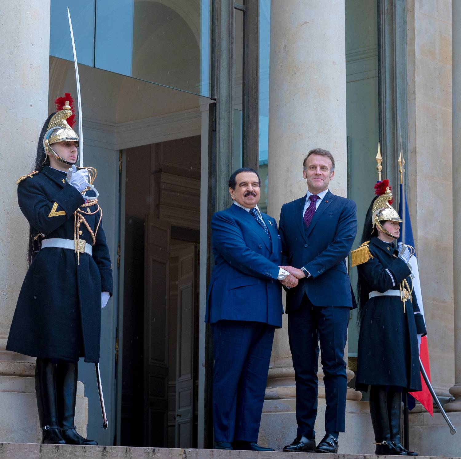 عقد حضرة صاحب الجلالة الملك حمد بن عيسى آل خليفة عاهل البلاد المعظم، حفظه الله ورعاه، وفخامة الرئيس إيمانويل ماكرون، رئيس الجمهورية الفرنسية الصديقة، في قصر الإليزيه بالعاصمة الفرنسية اليوم، جلسة مباحثات بمناسبة زيارة جلالته الرسمية للجمهورية الفرنسية بدعوة من فخامة الرئيس الفرنسي.