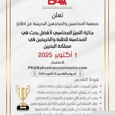 تعلن جمعية المحاسبين والمراجعين البحرينية عن إطلاق » جائزة التميّز المحاسبي« في الأول من أكتوبر 2025، وذلك في إطار سعيها المستمر للنهوض بمهنة المحاسبة وتعزيز دورها في خدمة الاقتصاد الوطني. وتأتي هذه المبادرة الوطنية لتكون منصة تحتفي بالكفاءات الواعدة من الطلبة والخريجين، وتبرز مساهماتهم البحثية والمشاريع التطبيقية التي تعكس قدرتهم على الدمج بين المعرفة الأكاديمية والاحتياجات العملية للمؤسسات.