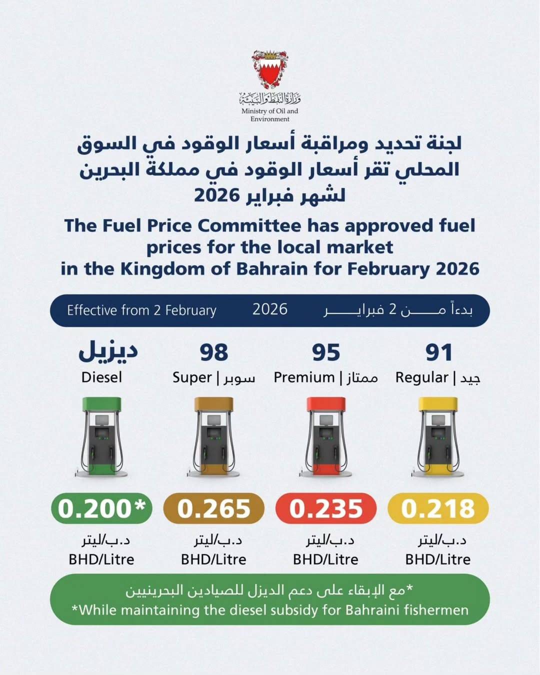 شاركها فيسبوك تويتر لينكدإن بينتيريست تيلقرام البريد الإلكتروني أقرت لجنة تحديد ومراقبة أسعار الوقود في السوق المحلي، أسعار الوقود في البحرين لشهر فبراير 2026، وذلك اعتباراً من اليوم الاثنين، مع الإبقاء على دعم الديزل للصيادين البحرينيين.
